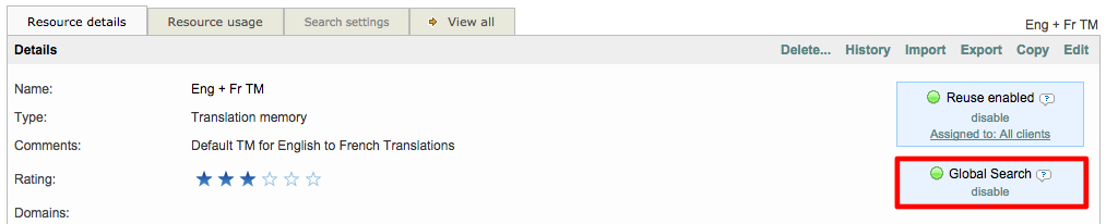 Global Search is a feature for finding words, segments, etc. throughout the entire system without having to access each individual location (see here). It is enabled by default for an imported TM. If it should be disabled, simply click on Disable.