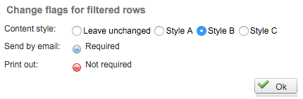 If you want to change these settings, click on Change Flags... above the Client Column. Here you can change the content style by ticking one of the provided radials. The Send by Email and Print out options may also be changed to one of the following: