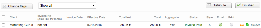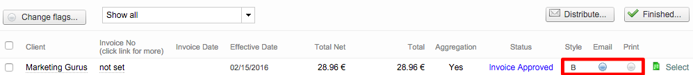 Several options are provided for distributing your invoice documents. They may be downloaded and printed, emailed to the client, etc. Currently this invoice is configured to be emailed and printed as noted by the Blue Circles under the appropriate columns.