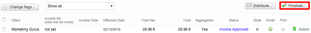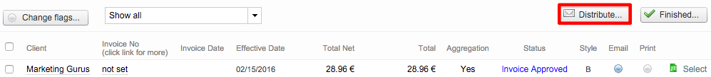 You may also click on the Client or Invoice Number column for the appropriate document to see additional information and view or modify the invoice. Once finished, click on Distribute... (or Distribute, selected...) to distribute the required invoice documents.