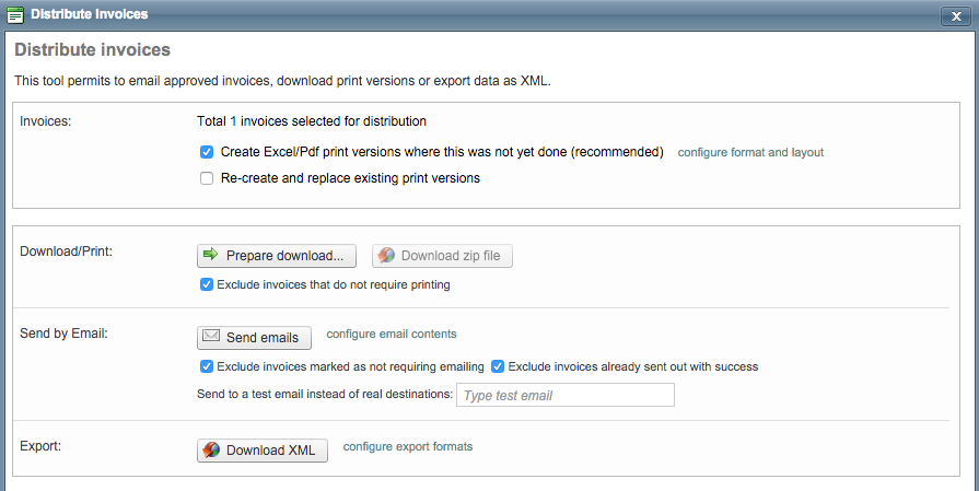 A pop-up window will appear. Here you may perform many actions for distributing the documents including: email, printing, and exporting the selected invoices. We recommend leaving the Create Excel/PDF print versions option enabled.