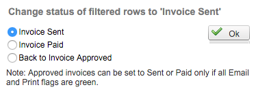 Then tick the radial for the desired option in the provided pop-up window and click on Ok when finished. An invoice can be marked as sent, paid, or switched back to approved in this window.