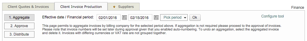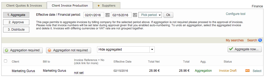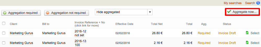 Note that only invoices which have an Effective Date and status Invoice Draft will be eligible for the aggregation process.