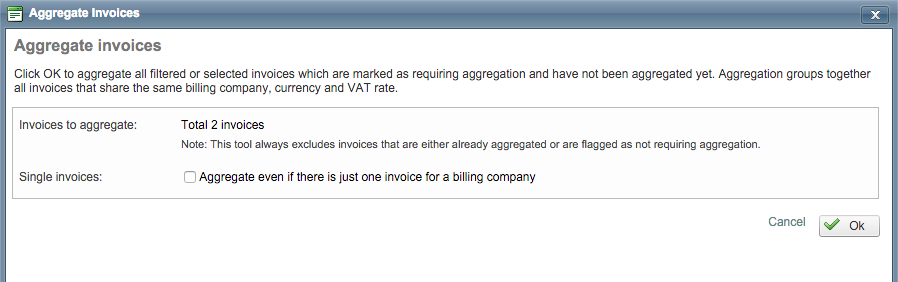 If single invoices are present in the displayed time period, you have the option to aggregate them as well. To do so, click on the checkbox next to Aggregate even if there is just one invoice for a billing company. When finished, click on Ok.