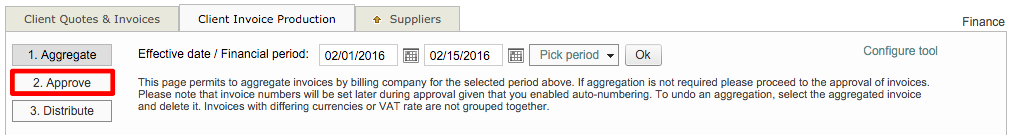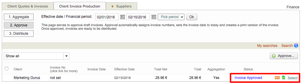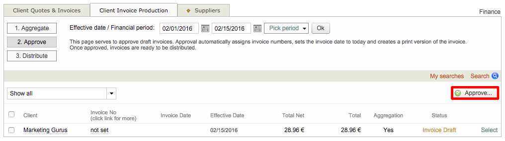 After the invoices have been aggregated for one or more clients within the configured date range, you will need to continue to Step 2 - Approving the Invoices. To do so, click on Approve at the top of the screen.