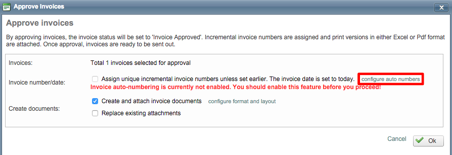 If the settings have not been enabled for invoice auto numbering, you will see the message below next to Invoice number/date. It is recommended to configure these settings prior to approving invoices.