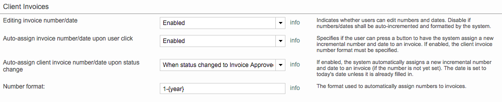 Then type in a format for the automatic invoice numbering. If you need ideas for how this is done, click on Info next to the Number Format drop-down menu. Once finished, scroll back to the top and click on Save.