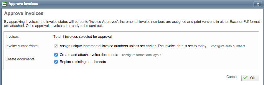 If Create and attach invoice documents is chosen, a new document will automatically be created and attached for each invoice. You may also check the box next to Replace existing attachments to overwrite any existing attachments. Then click on Ok.