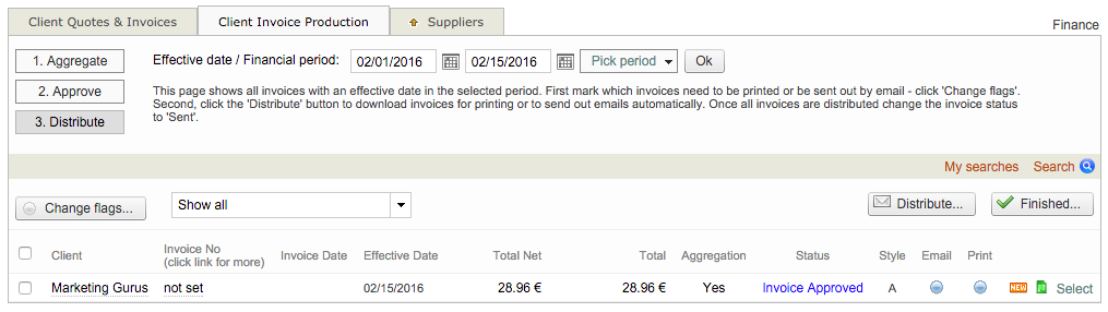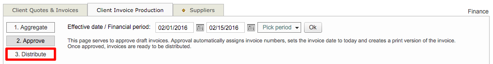 The final step involves distributing any approved invoices to the clients. This can be done by clicking on Distribute on the Client Invoice Production Tab.