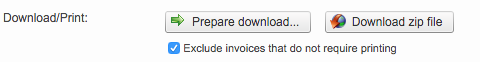 - Prepare Download - This option can be used to download and print the invoice. Click on Prepare Download and then Finish in the prompt window. Then click on Download Zip File. An option is provided and automatically enabled for excluding any invoices that do not require printing. To disable this option, tick the checkbox.