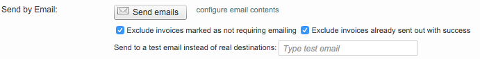 - Send Emails - This option can be used to send emails to the client(s) for each selected invoice. Click on Send Emails and then Finish in the prompt window. Options are provided for excluding any invoices that are not marked for email and any that have already been successfully sent. You can also enter a test email and have the documents sent prior to distributing them to the client.