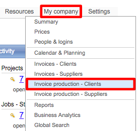 To combine two or more invoices in the system for a client, hover your mouse over My Company in the Menu Bar and then click on Invoice Production - Clients in the provided menu.