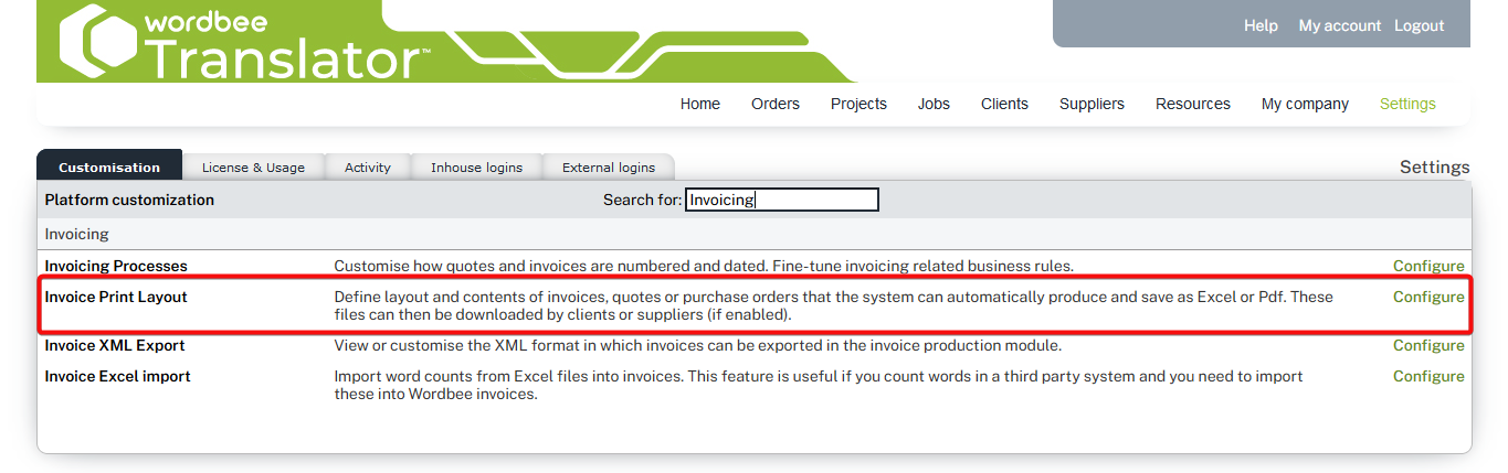 Open the Settings page and navigate down to Invoicing > Invoice print layout > Configure :