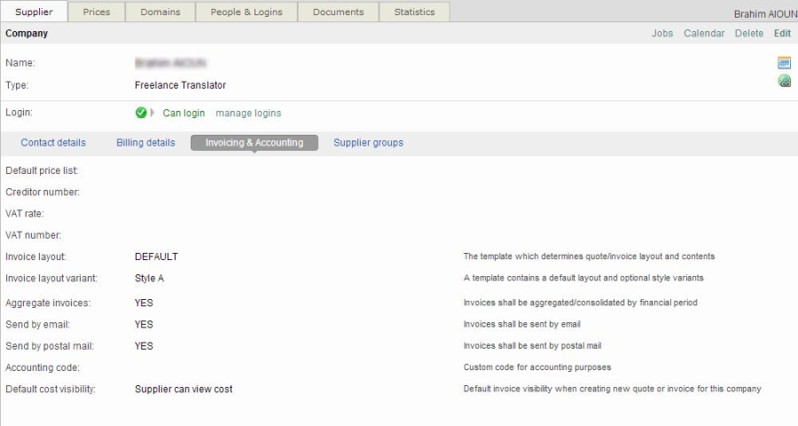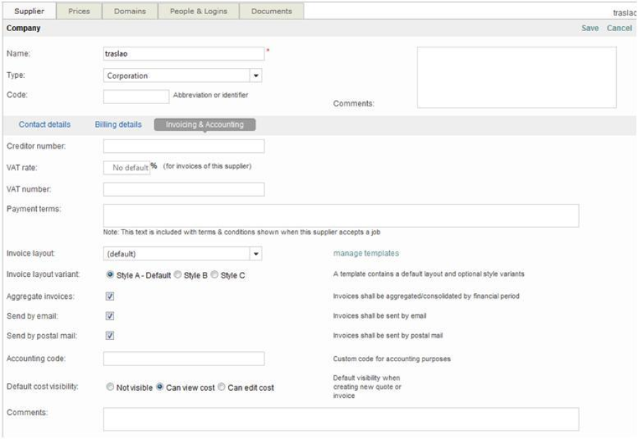 - Set all the options that you want for the supplier: its Creditor number, its VAT rate, the layout of the invoice, whether the invoices are to be sent by email automatically and/or by post mail, add comments, payment terms...