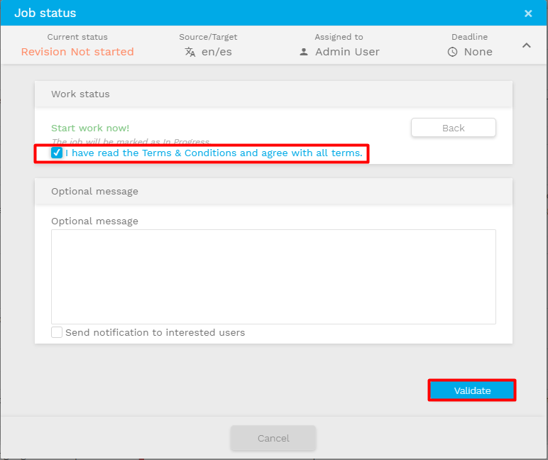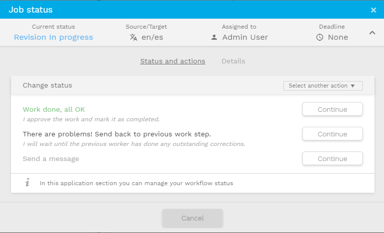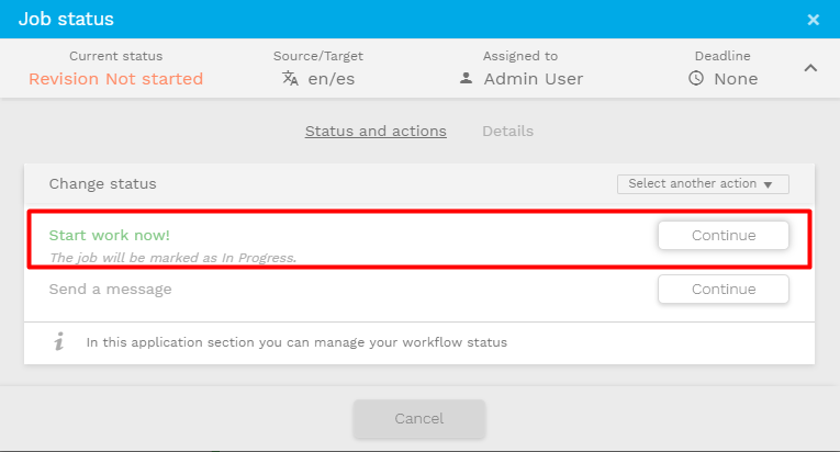 Depending on your user profile, the segments of the editor may be locked when you enter the job for the first time. This is to prevent you from editing until you confirm your availability to perform the task. Just click on the status and a popup will open, presenting the main actions to take right away. You will be able to take the job assignment by clicking in continue and optionally send a message to your manager.