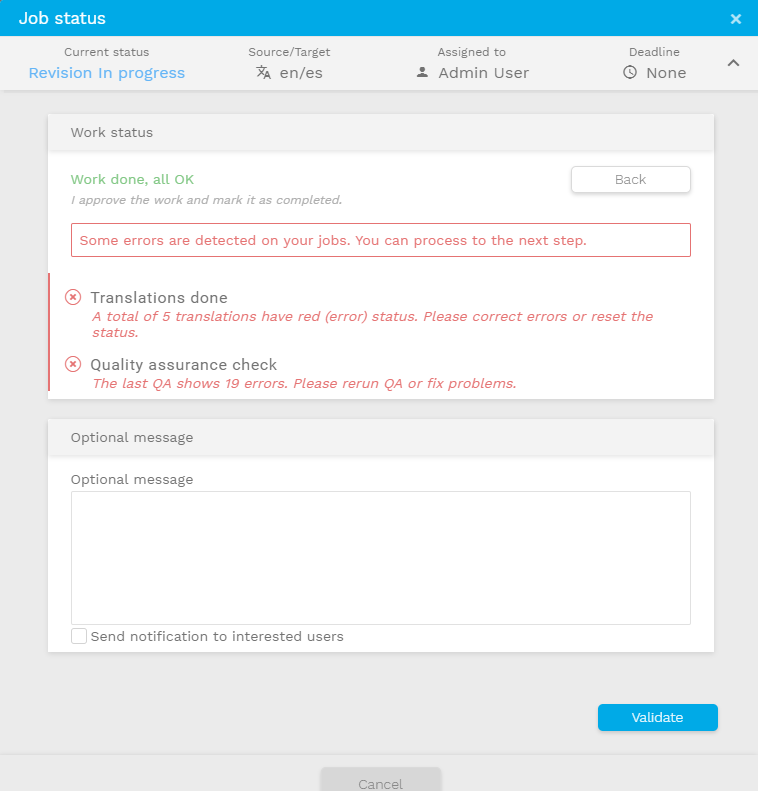If the current job status is “In progress” and users may select it to open the window to complete the current job. By selecting “Work done, all OK” the current Job will be marked as “Completed”. Once a Job is completed users won’t be able to do any changes to the segments anymore.