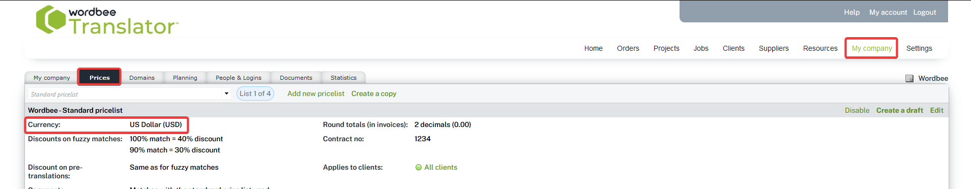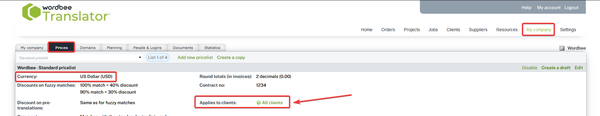 Client price lists are configured under My Company and the Prices tab. You can create several price lists and assign each to specific clients.
