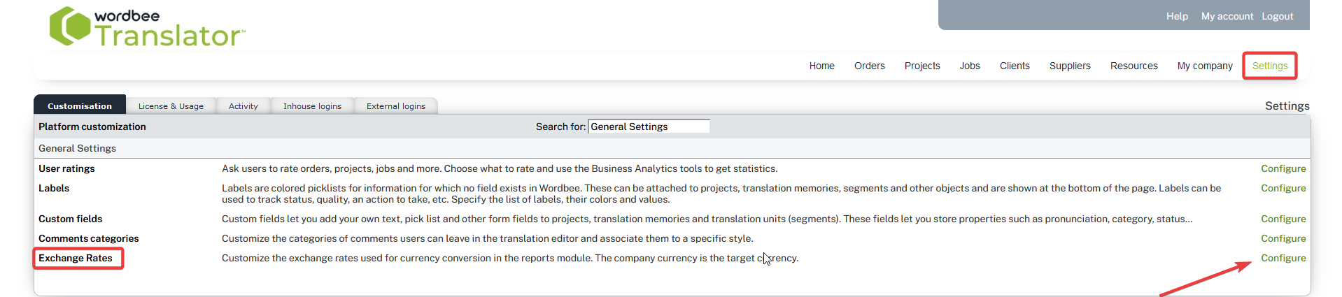 The actual currency conversion rates are configured in the Settings page: