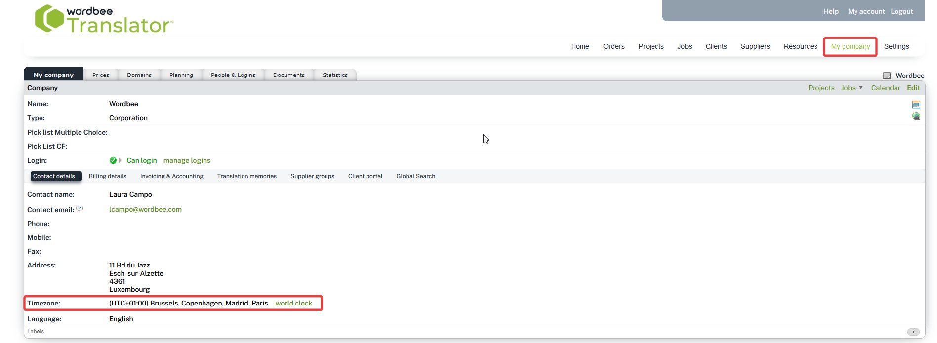 The time zone is configured in My Company page.