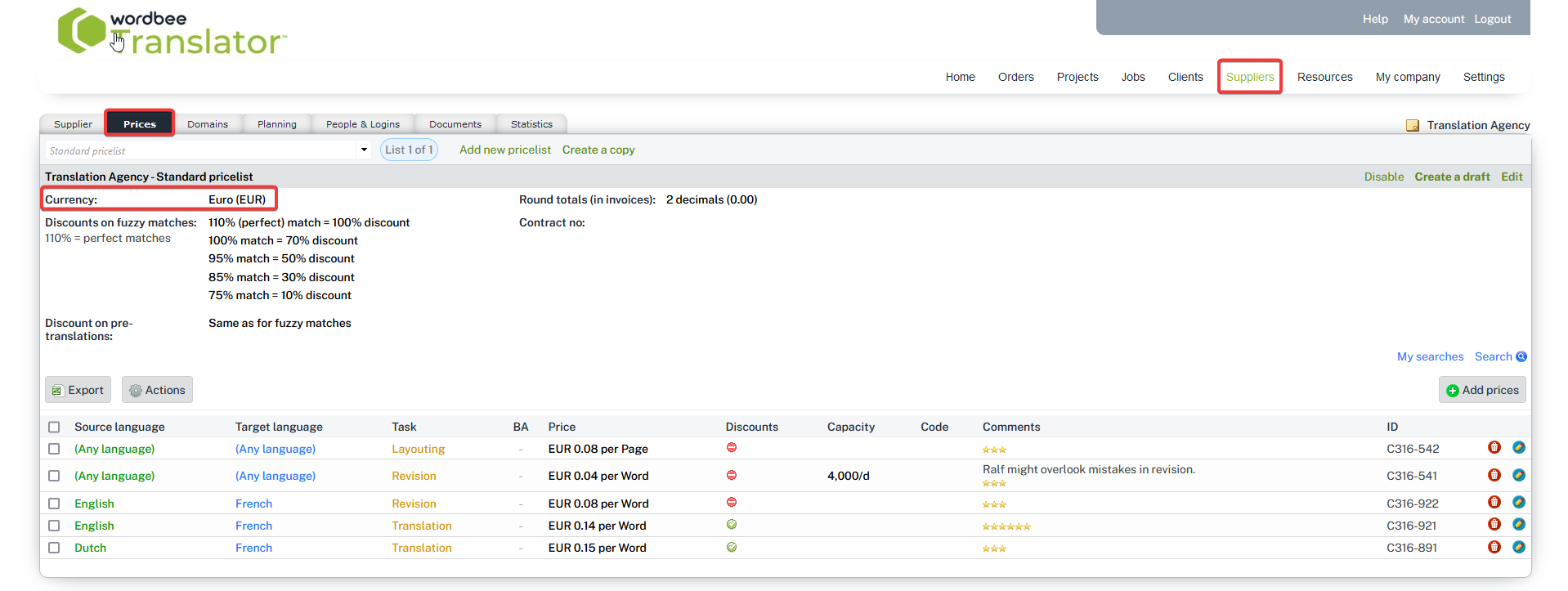 This is done when you create the price lists for your clients and suppliers. For suppliers, this is configured in the Prices' tab of a supplier's page: