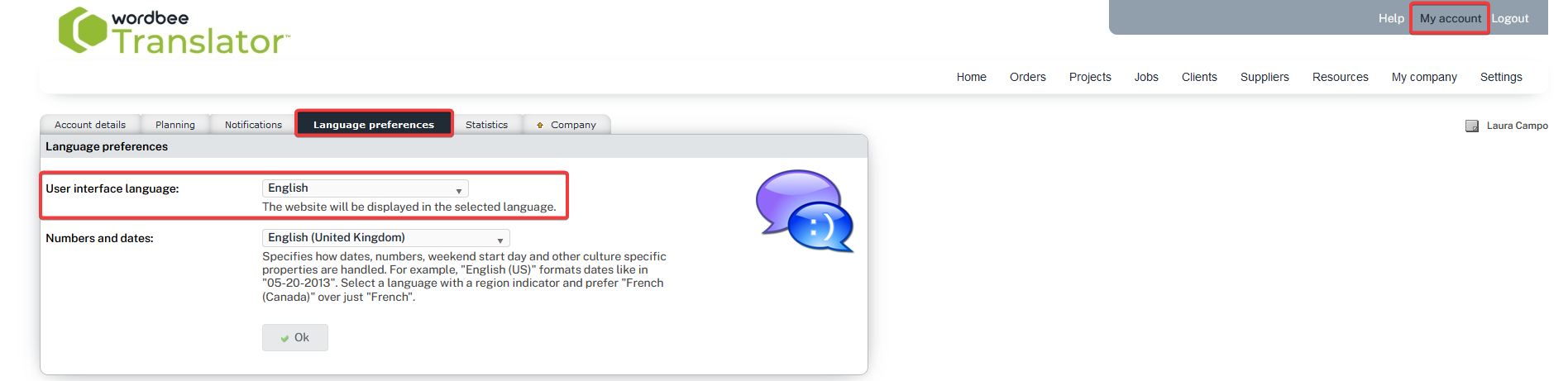 You choose the language in the My Account page under the Language preferences tab: