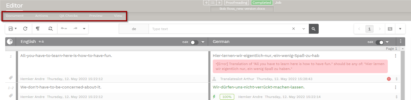 At the top of the Translation Editor you will find the main features for document management. You can download and check your reference materials, gain access to batch actions, launch a preview of the source or target files, run QA checks, adjust the display of different elements of your CAT environment or even export/import your project (if you have the required user rights).