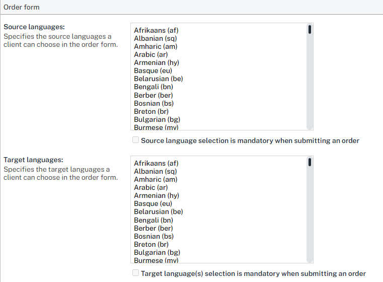 Sometimes it is necessary to add or change source or target languages in a job. If you can't find the language you need, you should first check if the language is supported in Wordbee Translator. If it is supported, you just need to enable the language for order forms in general. To do this, go to Settings > Classic Order Form. Here you can enable and disable source and target languages for use in orders.