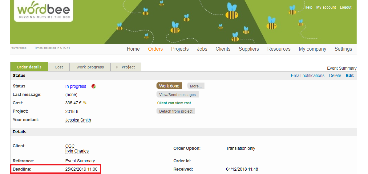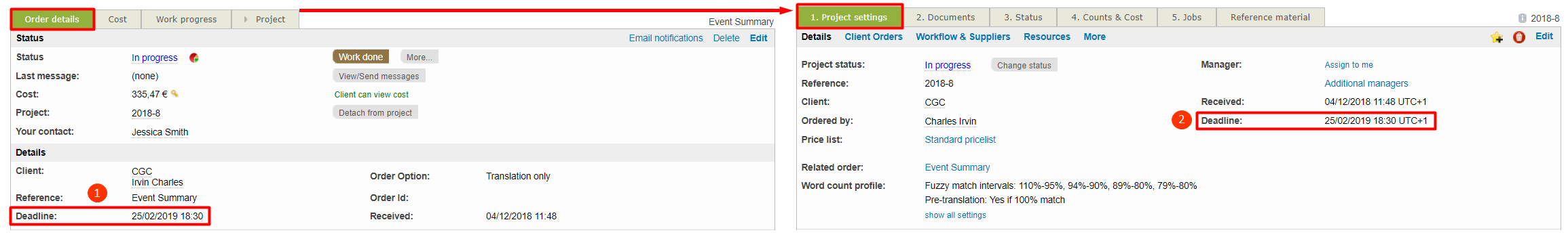 If deadlines are set for an earlier date, you will need to decide and confirm with your client that you can meet the deadline, the same with the workers involved in the ongoing work. This means you will need to update the deadline in the order and in the project individually, as shown in figures 1 and 2 below.