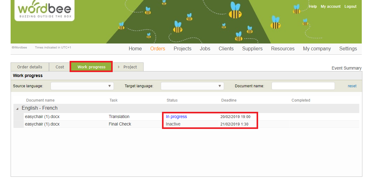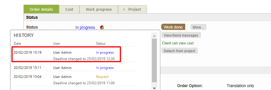 Remember you can always communicate with your client using the message box, which also registers status and deadline changes (registered in the status history popup, as shown above). All users following the order updates will be notified of such events.