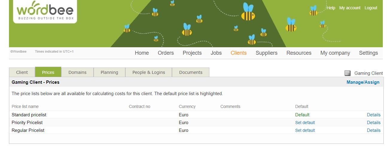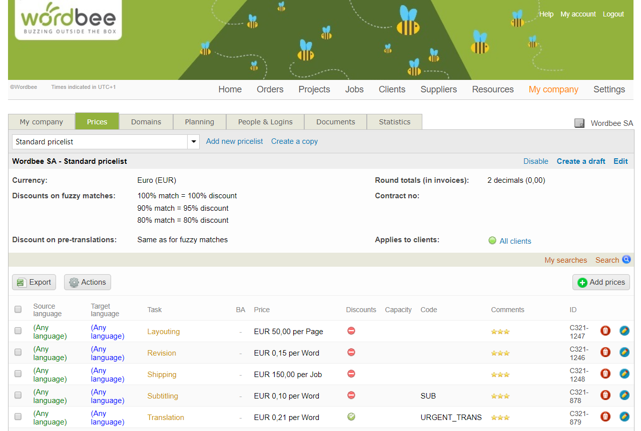 Wordbee determines the quote for a job and final pricing based on the what prices have been entered into the system. The pricing information for a client can be seen by viewing the Prices Tab for the client within the system. Every client entered into the system will have a standard price list; however, additional pricelists may be configured for specific types of work, documents, etc.