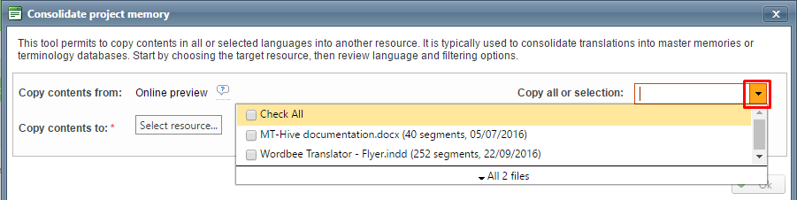 The following steps will be the same whether you use the consolidation message or access this option by viewing the resources for the project. In the provided pop-up window you will need to decide first if you want to consolidate the whole project memory (default) or just the translations done for some documents within the project: