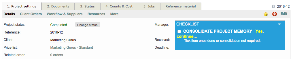 The consolidation of project memories can be mandatory or optional. If it is configured in the settings to be mandatory, a pop-up will appear when viewing any completed project in the system. The consolidation message will appear as shown below when viewing the details of a completed project: