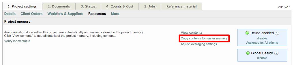 As documents are translated within a project, these translations are added to the project memory. Every project has a memory that is continuously updated as work is performed on the online CAT editor, until it is completed.