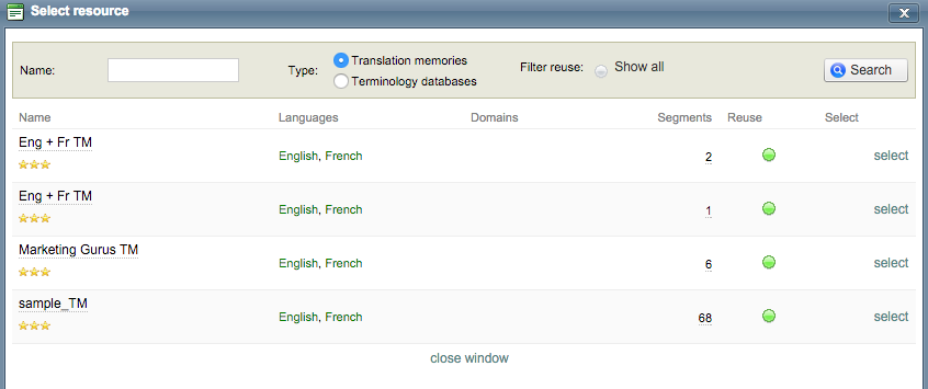 Additional options will appear in the initial pop-up window after a resource has been chosen. If many TM's are present in the system, you can use the Search option to locate the TM faster in the list.