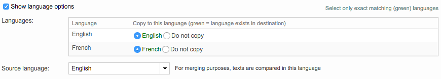 Tick the Show language options checkbox to see the current language settings. This shows the languages that will be copied to the selected master TM and the currently configured source language. Typically changes are not required here because the system does the mapping for you. You can elect to not copy a language if it is not needed or change the source language.