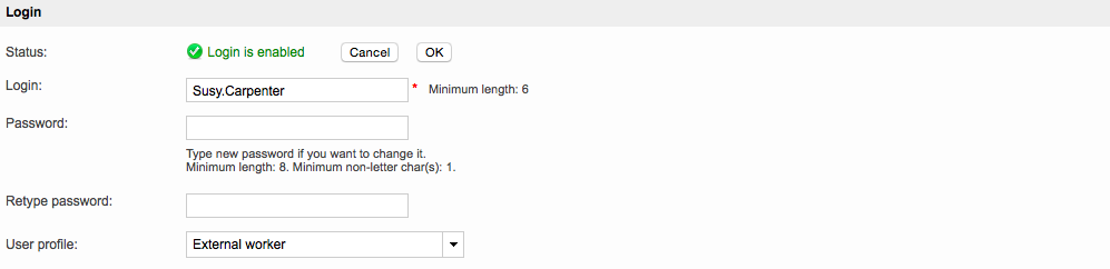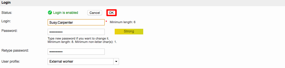 You will need to enter and retype a password as well as make any additional needed changes to the external login. Then click on OK.