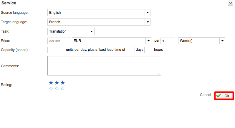 Then choose a Source Language, Target Languages, Task, Price, and Capacity within the provided screen. When finished, click on OK in the bottom right corner of this screen.