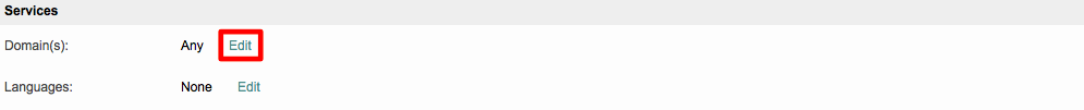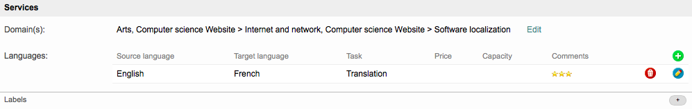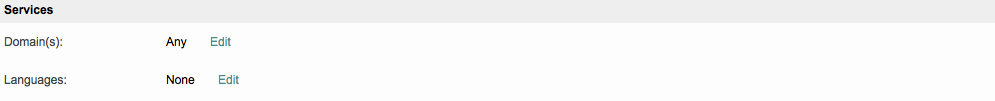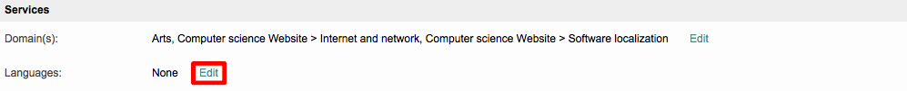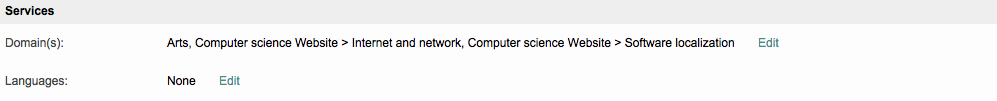 The Services Section contains information about the domains a user works within and the languages they use for project tasks. If no Domains or Languages have been configured, this section will appear as shown below: