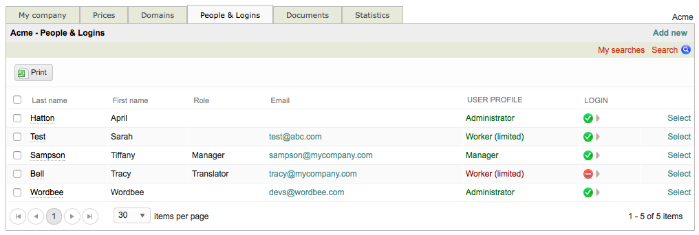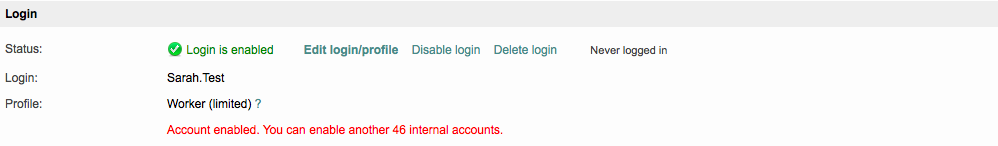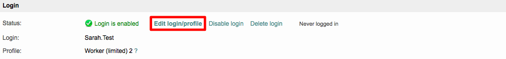 As displayed in the list, Sarah Test now has the Worker (limited) user profile. Not every change is displayed in this list and to see further details, you will need to select a specific inhouse login.