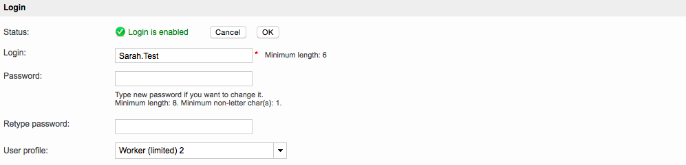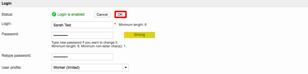 Once all changes have been made, click on OK to save them for the chosen inhouse user. In this example, the Password has been entered and the user's profile has been changed to Worker (limited).