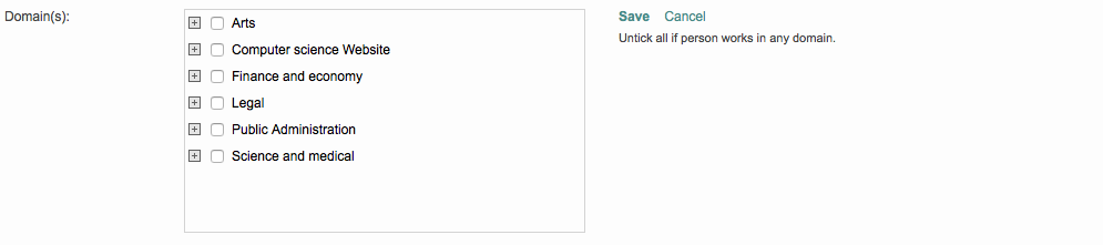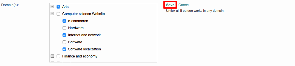 This may include an entire set of domains and subdomains (Arts for example) or only certain subdomains like e-commerce or software localization. When finished choosing the domains, click on Save.