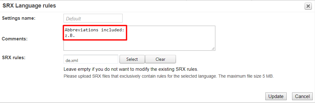 Please note that if you want to create a new/additional segmentation profile or set of segmentation rules for a given language, you will need to Create a Custom SRX Rule Configuration for that language. This function is only for editing a segmentation profile for a specified language.