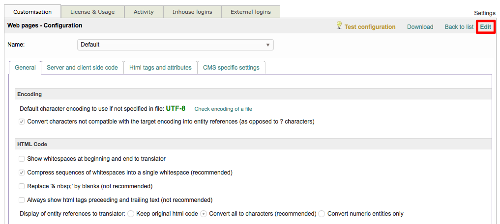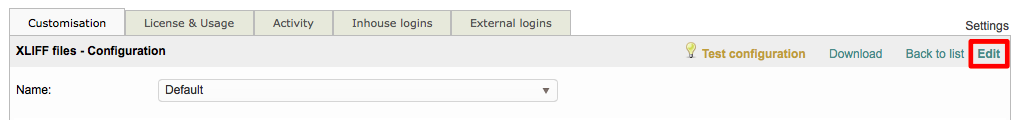Step 1: You will need to click on Edit to begin making changes to the chosen XLIFF configuration. If only the Default configuration is present for XLIFF files, simply edit it and then Save as New when finished.