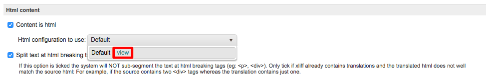 Step 4: If you do not specify something different, the Default HTML configuration will be used. To change this, click on the drop-down menu next to "HTML configuration to use" and then click on View located to the right of default in the menu. This will allow you to view the default configuration and make changes for creating a custom HTML configuration.