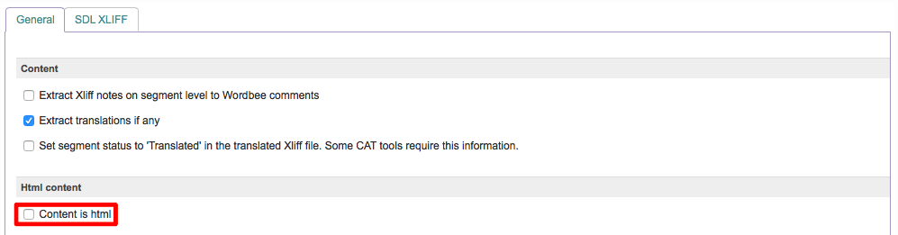My XLIFF file contains HTML content. How can I ensure it is handled appropriately by Wordbee Translator?