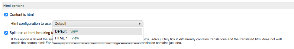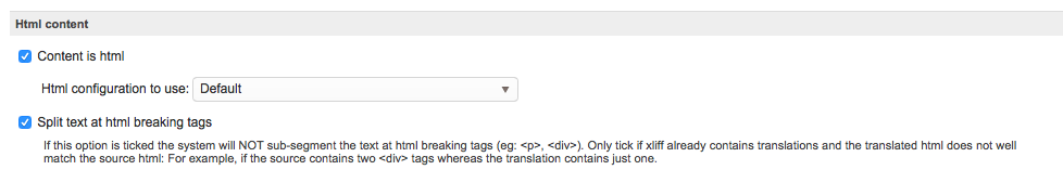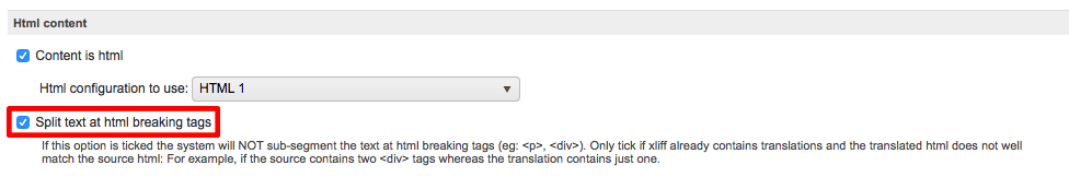 Step 7: By default, the Split text at html breaking tags is enabled (checked); however, you may uncheck (disable) it if needed prior to saving the custom XLIFF file configuration. This option when disabled (unchecked) will sub-segment the text at each HTML breaking tag (i.e. <p>, <div>, etc.). It should only be enabled when the file contains existing translations that do not properly match the source HTML.