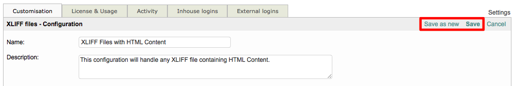 Step 8: You will need to save the change to the chosen XLIFF configuration. If you are editing a configuration other than the Default, simply click on Save. Otherwise, enter a Name and Description for the new configuration and then click on Save as new in the upper right corner of the screen.