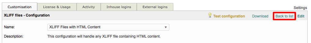 Step 9: The new XLIFF file configuration has now been added to Wordbee Translator. To view it within the list of available file format configurations, click on Back to list in the top right corner of the screen.