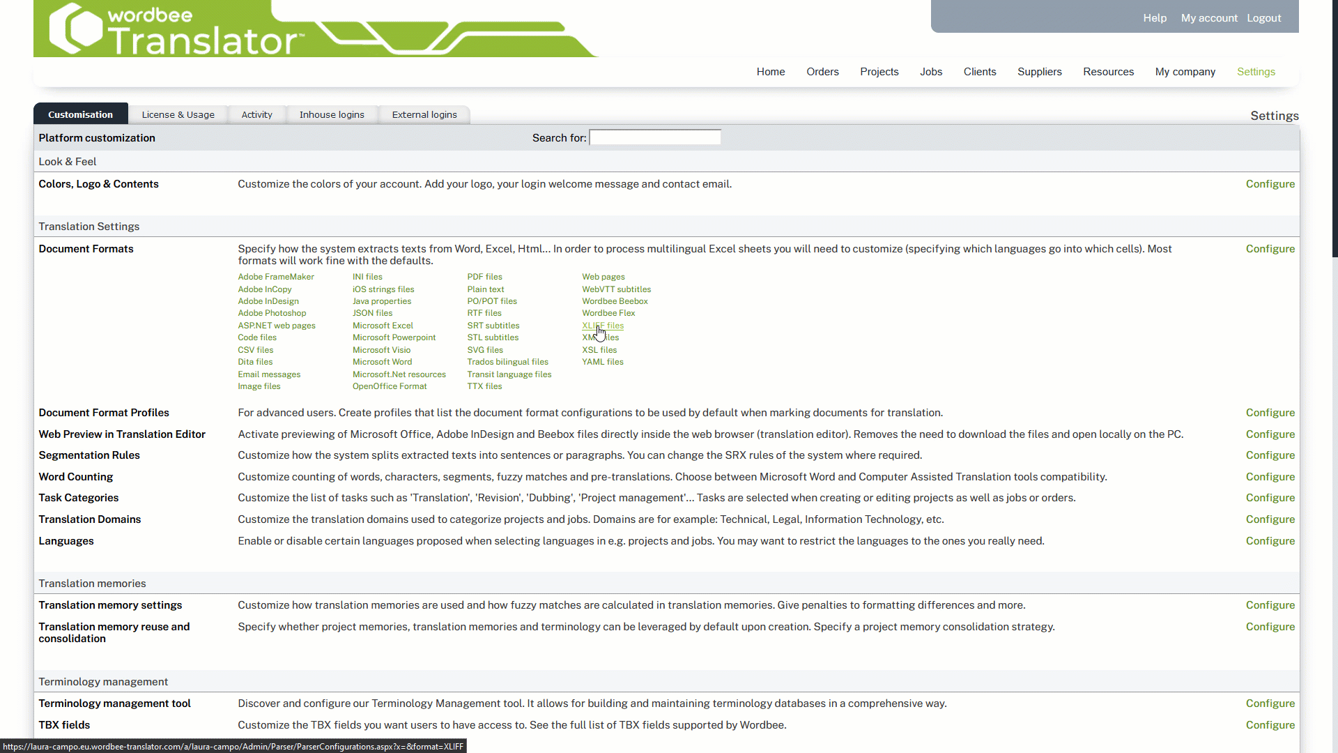 To do so, access the desired XLIFF configuration by going to Settings > Translation Settings > Document Formats and choosing the XLIFF format type.
