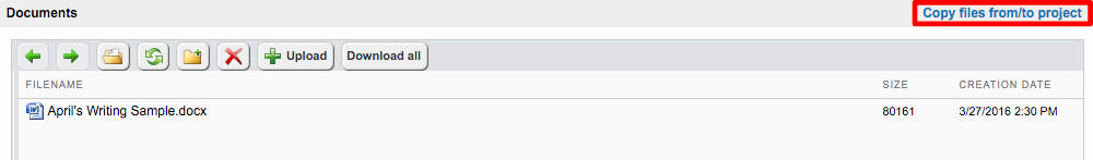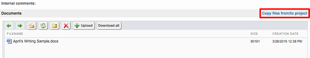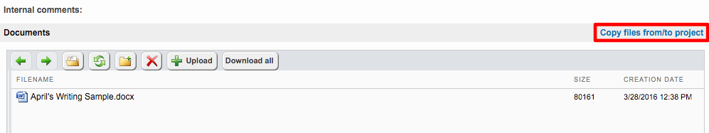 After the project has been attached, the documents need to be copied to it so they can be marked for translation, word counted, etc. Scroll down to the Documents Section of the Order Details Tab. Then click on Copy files from/to project and choose Copy files toproject in the drop-down menu.